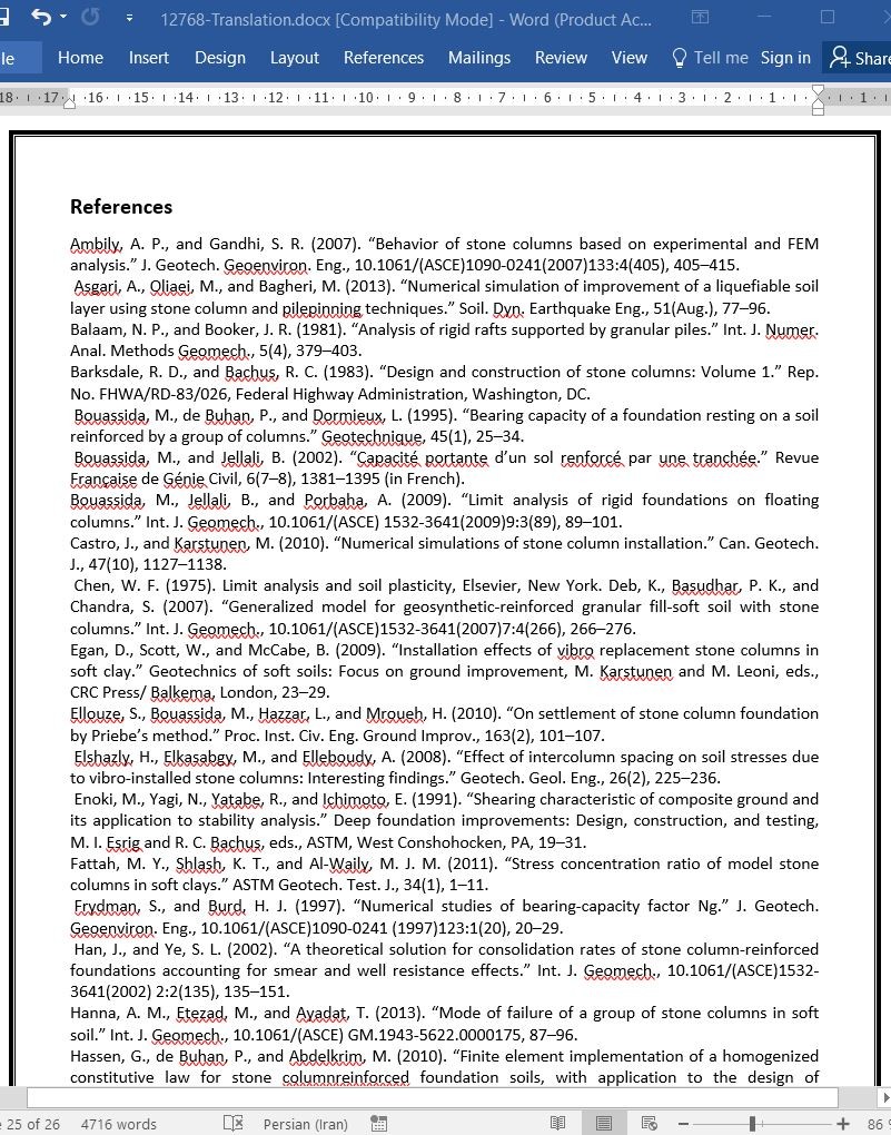 نصب ستون سنگی یک تکنیک امکان پذیر، به صرفه و بهسازی زمین دوستدار محیط زیست می باشد. ستون ها از سنگدانه فشرده ساخته و در خاک نرم به صورت تقویت کننده ها برای افزایش مقاومت برشی توده خاک، و براساس آن، ظرفیت باربری خاک نصب می شوند. درحالیکه یک ستون سنگی ممکن است توسط برآمدگی تخریب شود، یک گروه از ستون های سنگی با خاک احاطه کننده ممکن است توسط مکانیزم برشی تورفتگی، محلی یا کلی، وابسته به خاک/ستون ها/هندسه سیستم تخریب شوند. حالت گسیختگی زمین تقویت شده می-تواند براساس هندسه زمین و پارامترهای استحکام ستون سنگی و خاک نرم تشخیص داده شود. این مقاله یک مدل تحلیلی را برای پیش بینی ظرفیت باربری خاک نرم تقویت شده با ستون های سنگی تحت شالوده گسترده صلب مربوط به مکانیزم گسیختگی کلی برشی ارائه می کند. این مدل از روش تعادل حدی و مفهوم ویژگی های ترکیب خاک تقویت شده استفاده می کند. تئوری پیشنهادی برای مورد ظرفیت باربری پایه ها در خاک همگن و از طریق نتایج آزمایشگاهی و عددی موجود در مقالات برای این مورد اعتبارسنجی شد. روش طراحی و نمودارها برای اهداف عملی ارائه می شوند.